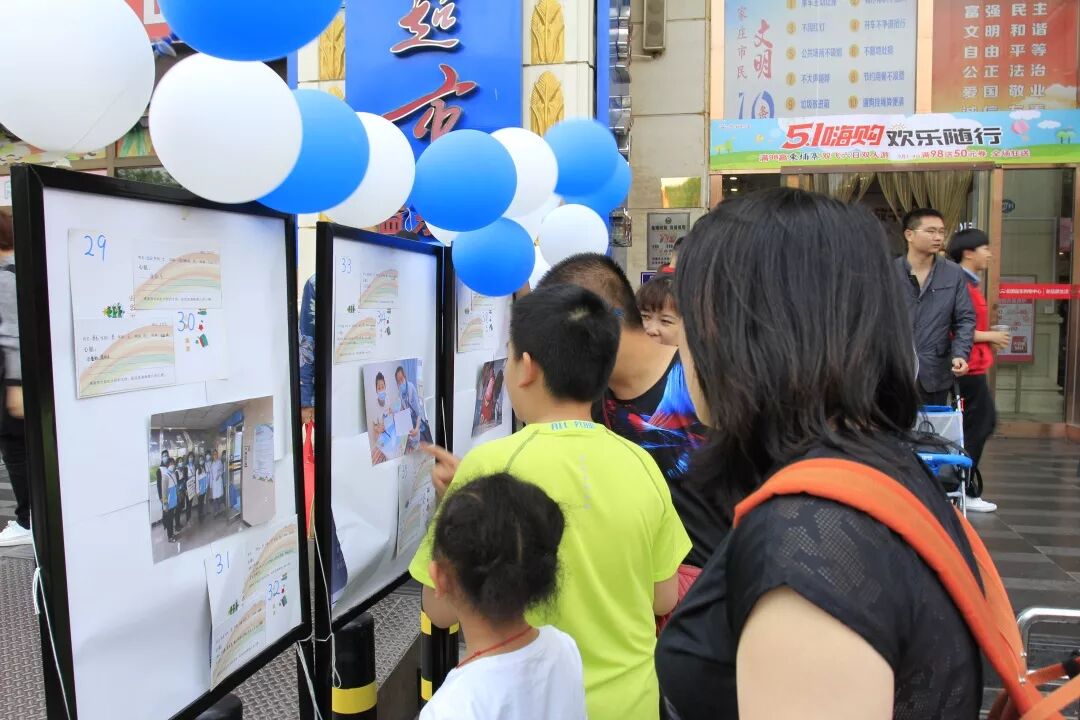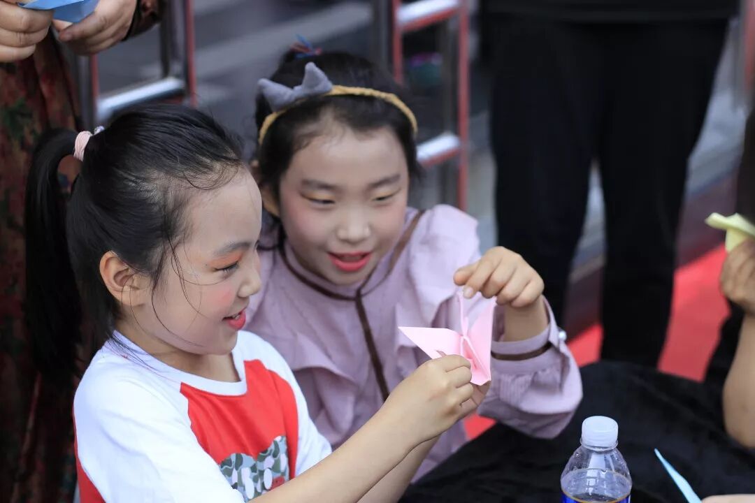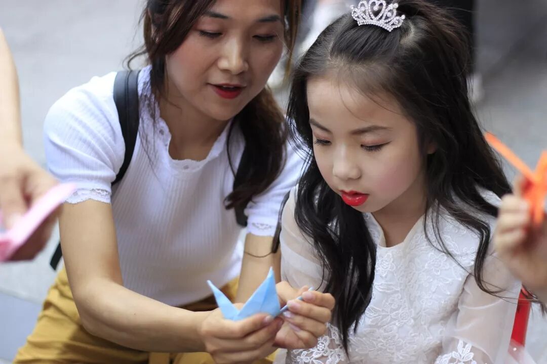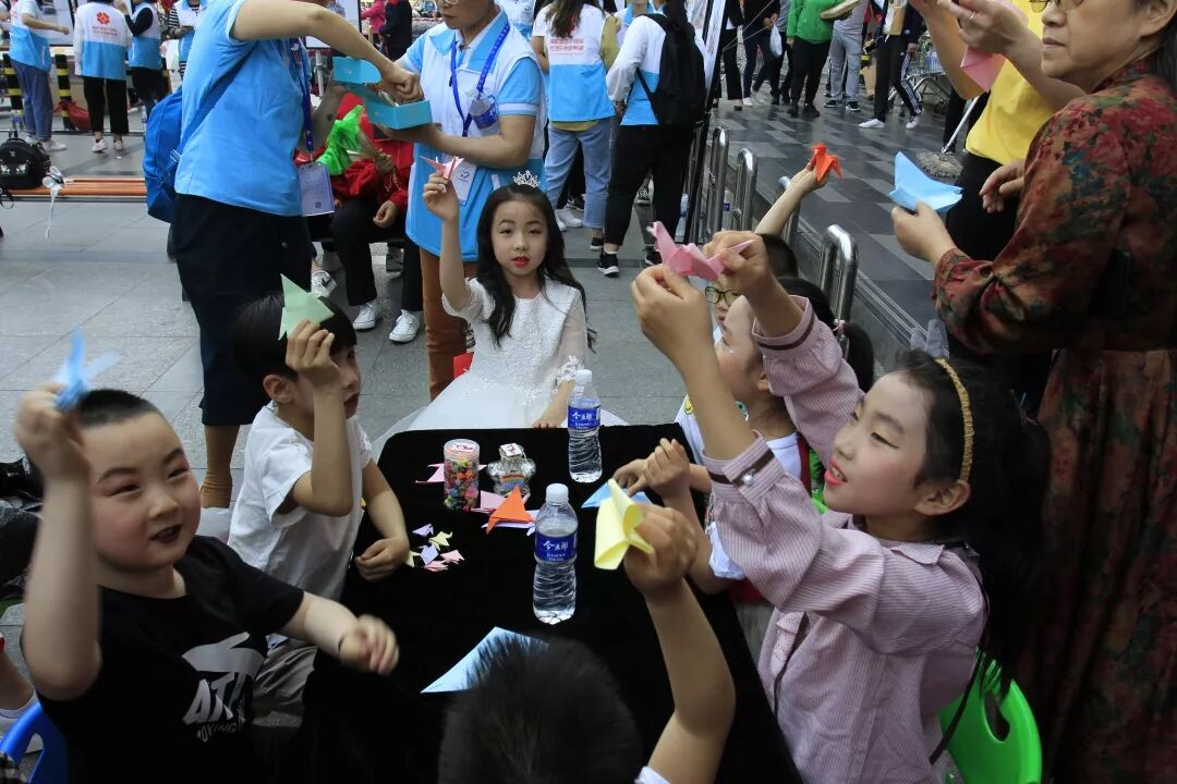 家长带着自己的孩子在台下的活动区里为患儿折千纸鹤